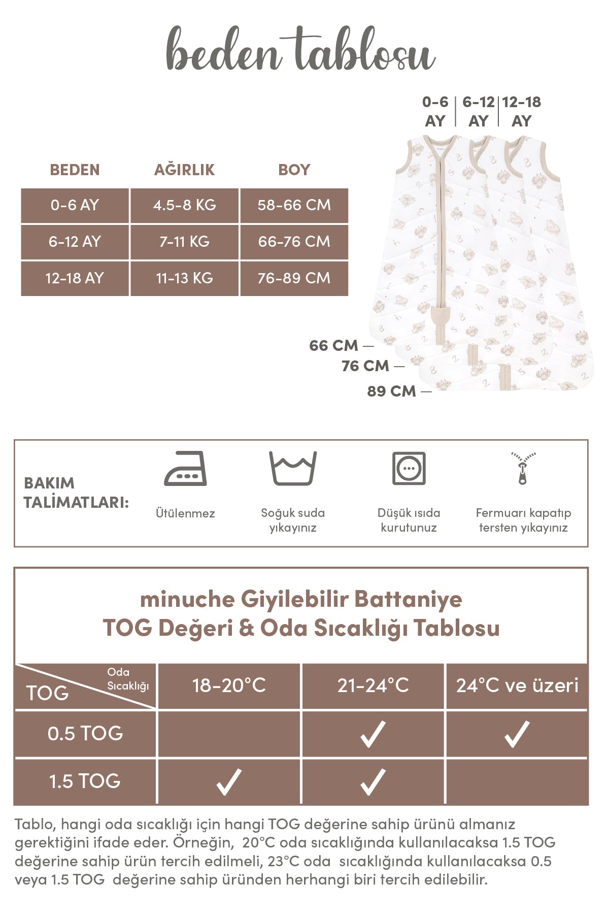 • 0.5 TOG Giyilebilir Battaniye daha sıcak havalar için uygunken, 1.5 TOG değerine sahip Giyilebilir Battaniye daha soğuk havalar için uygundur.